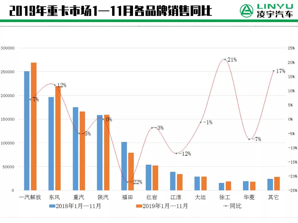 從數(shù)據(jù)可以看出,一汽解放11月份銷售重卡1.75萬輛,今年1-11月,解放重卡累計(jì)銷售26.91萬輛,同比增長7%,市場份額為25%,毋庸置疑,繼續(xù)穩(wěn)坐行業(yè)累計(jì)銷量寶座。
