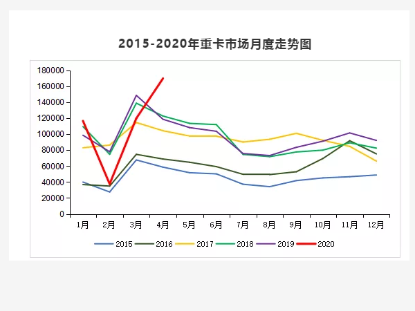 受疫情影響,2020年前四個月的重卡市場,整體比較坎坷,呈現(xiàn)出V形走勢曲線。雖然1月份銷量創(chuàng)下歷史新高,同比增長18.2%,取得了開門紅,但2、3月份市場連續(xù)出現(xiàn)大跌,分別同比下滑51.8%、19.3%;直到4月份,隨著新冠肺炎疫情對國內經濟的影響逐漸消退,市場才重回上升趨勢,并且呈現(xiàn)出產銷兩旺的發(fā)展勢頭。