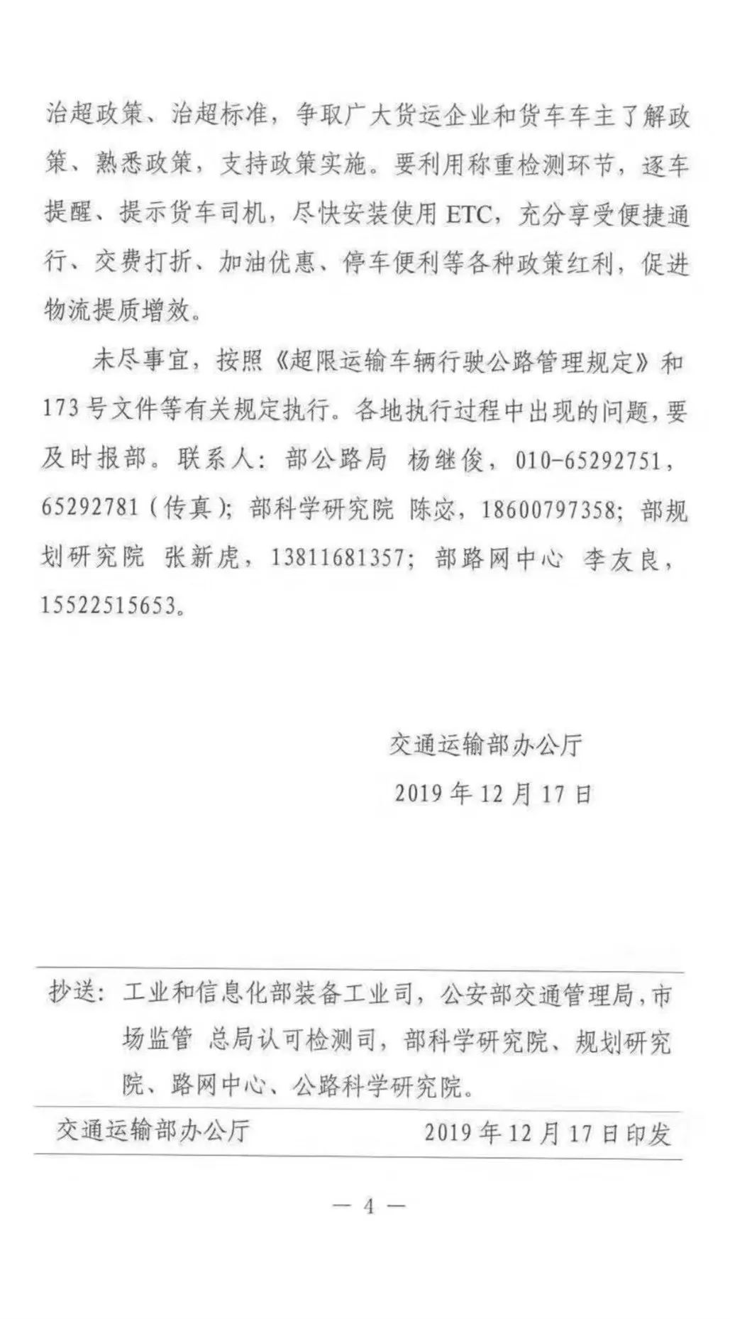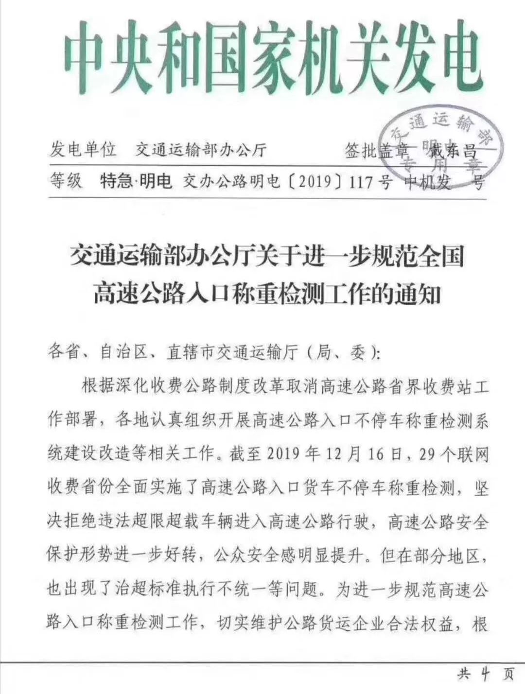 為進(jìn)一步規(guī)范高速公路入口稱重檢測工作,切實維護(hù)公路貨運(yùn)企業(yè)合法權(quán)益,根據(jù)相關(guān)法律法規(guī)和規(guī)定,交通運(yùn)輸部特地發(fā)文對有關(guān)事項通知如下: