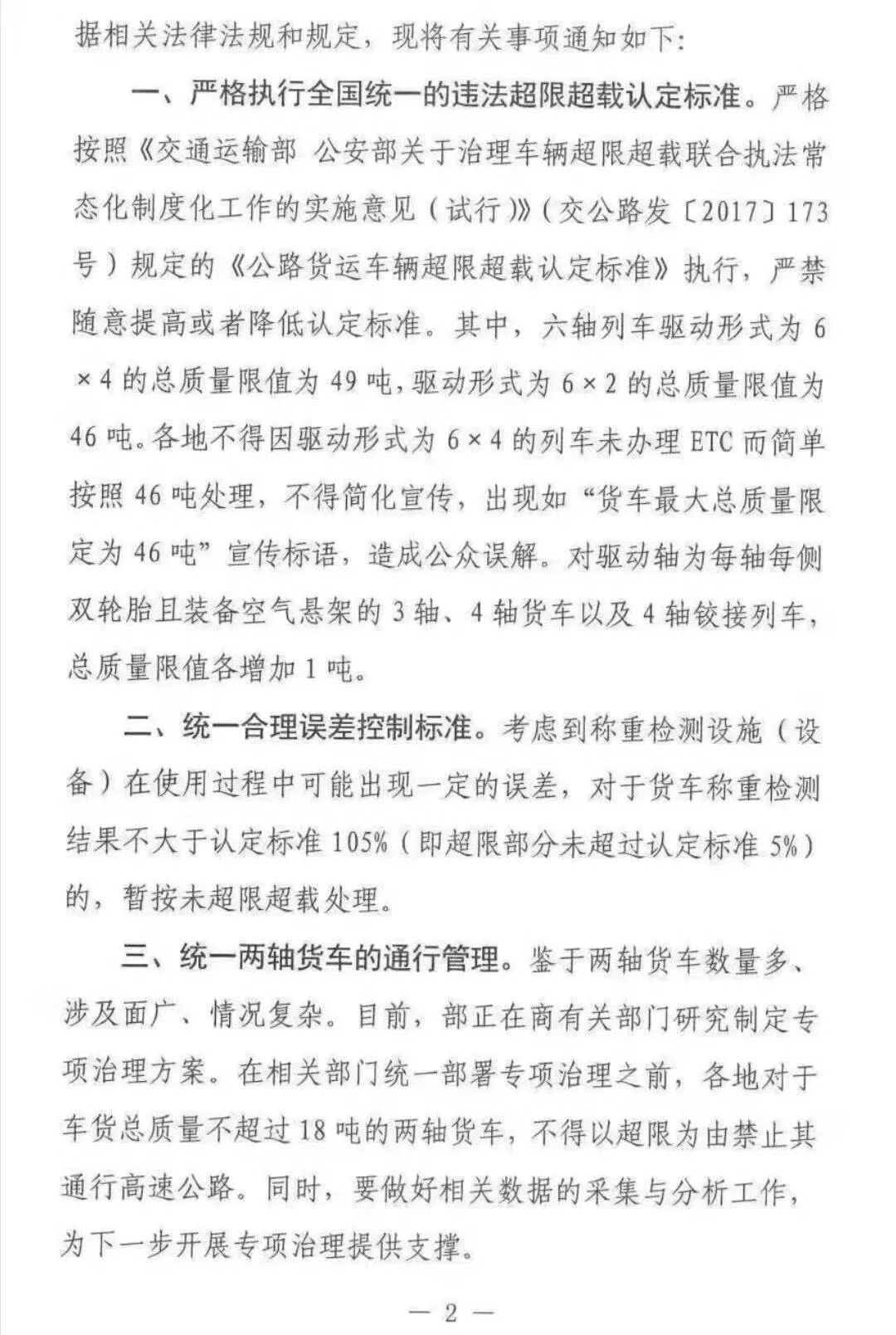 鑒于兩軸貨車數(shù)量多、涉及面廣,情況復(fù)雜,目前,交通部正在商有關(guān)部門研究制定專項治理方案,在相關(guān)部門統(tǒng)一部署專項治理之前,各地對于車貨總質(zhì)量不超過18噸的兩軸貨車,不得以超限為由禁止其通行高速公路。