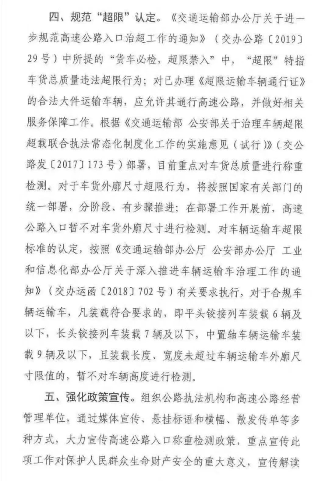 《交通運(yùn)輸 部辦公廳關(guān)于進(jìn)一步規(guī)范高速公路入口治超工作的通知》(交 辦公路[2019]29號)中所提的“貨車必檢,超限禁入”中,“超限”特指車貨總質(zhì)量違法超限行為;對已辦理《超限運(yùn)輸車輛通行證》的合法大件運(yùn)輸車輛,應(yīng)允許其通行高速公路,并做好相關(guān)服務(wù)保障工作。根據(jù)《交通運(yùn)輸部公安部關(guān)于治理車輛超限超載聯(lián)合執(zhí)法常態(tài)化制度化工作的實施意見(試行)》(交公路發(fā)[2017]173號)部署,目前重點對車貨總質(zhì)量進(jìn)行稱重檢測。對于車貨外廓尺寸超限行為,將按照國家有關(guān)部門的統(tǒng)一部署,分階段、有步驟推進(jìn);在部署工作開展前,高速公路入口暫不對車貨外廓尺寸進(jìn)行檢測。對車輛運(yùn)輸車超限標(biāo)準(zhǔn)的認(rèn)定,按照《交通運(yùn)輸部辦公廳公安部辦公廳工業(yè)和信息化部辦公廳關(guān)于深入推進(jìn)車輛運(yùn)輸車治理工作的通知》(交辦運(yùn)函[2018]702號)有關(guān)要求執(zhí)行,對于合規(guī)車輛運(yùn)輸車,凡裝載符合要求的,即平頭鉸接列車裝載6輛及以下,長頭鉸接列車裝載7輛及以下,中置軸車輛運(yùn)輸車裝載9輛及以下,且裝載長度、寬度未超過車輛運(yùn)輸車外廓尺寸限值的,暫不對車輛高度進(jìn)行檢測。