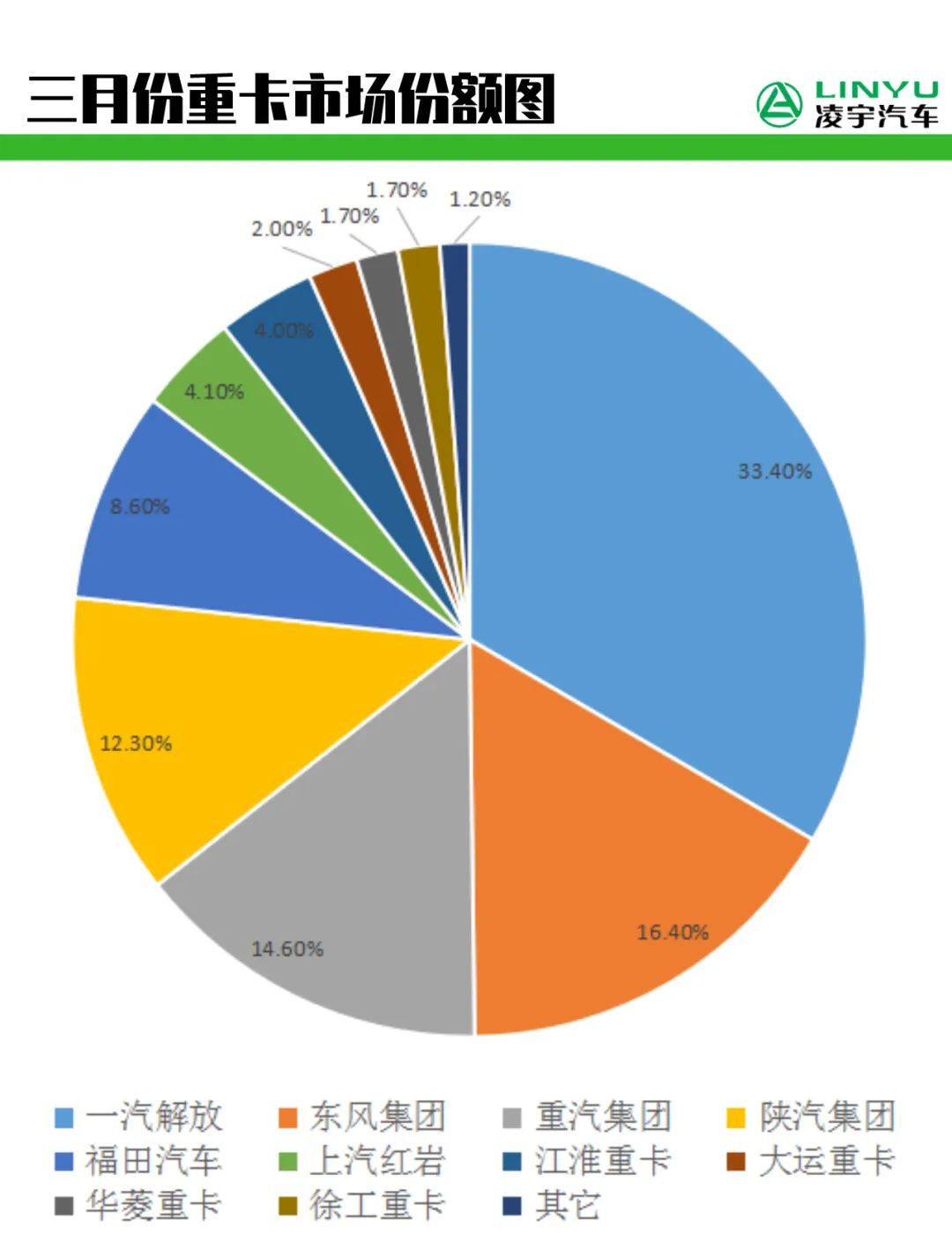 3月份,一汽解放銷售重卡數(shù)量2.5萬輛,繼續(xù)蟬聯(lián)寶座,2020年季度累計銷量為8.92萬輛,市場份額達到了33.4%。東風(fēng)重卡三月份累計銷量4.37萬輛,市場份額為16.4%。