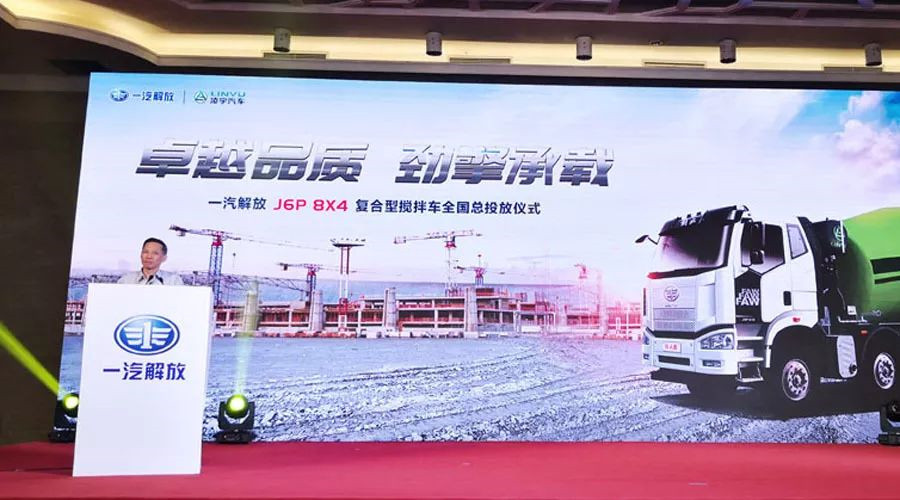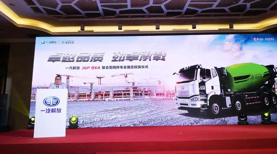 酒店會議廳燈火璀璨,高朋滿座,“汽解放J6P 8*4復(fù)合型攪拌車總投放儀式”正在這里隆重舉行。搭載中集凌宇上裝的汽解放J6P 8*4復(fù)合型攪拌車底盤正式對世人發(fā)布。
