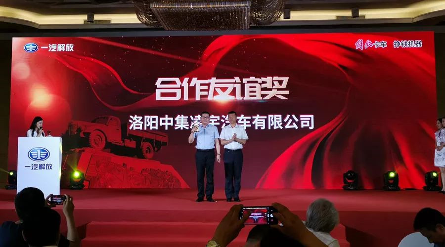 接下來進入頒獎環(huán)節(jié),汽解放為四川巨峰工程機械有限公司頒發(fā)了核心網(wǎng)絡(luò)獎,為洛陽中集凌宇汽車有限公司頒發(fā)了合作友誼獎。