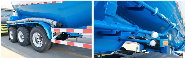 這批粉罐半掛車針對潮濕粉煤灰的運(yùn)輸,特別優(yōu)化了管路及流化系統(tǒng),采用新型氣室,結(jié)構(gòu)緊湊,安全耐用,新型罐體結(jié)構(gòu),抗壓效果好,流化角度大,卸料快、剩余少。
